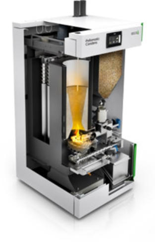 Pelletskessel am Markt. Sie benötigt nur die Fläche eines großen Kühlschranks.